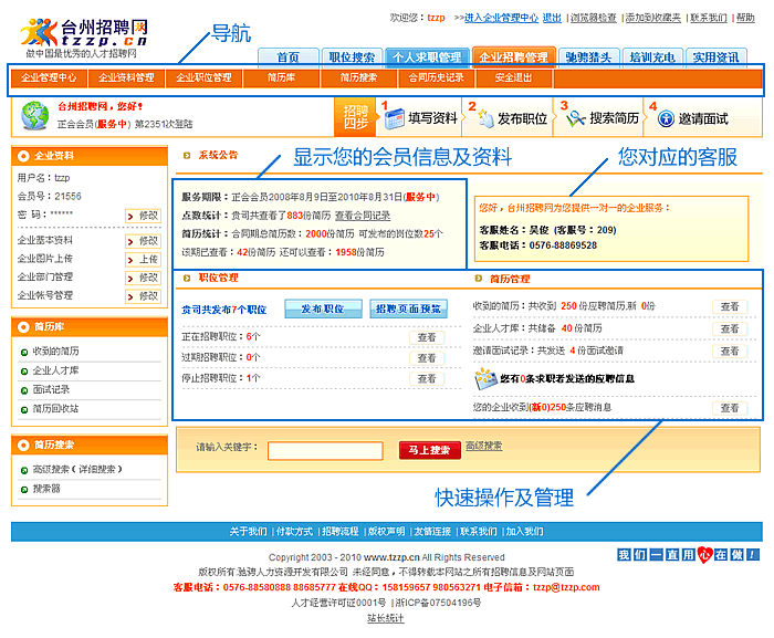 登录企业招聘管理后,会转到以下页面,首页分为:导航区,基本资料显示区,对应客服,服务期限及简历数,左侧基本功能区,快速操作区,搜索工具